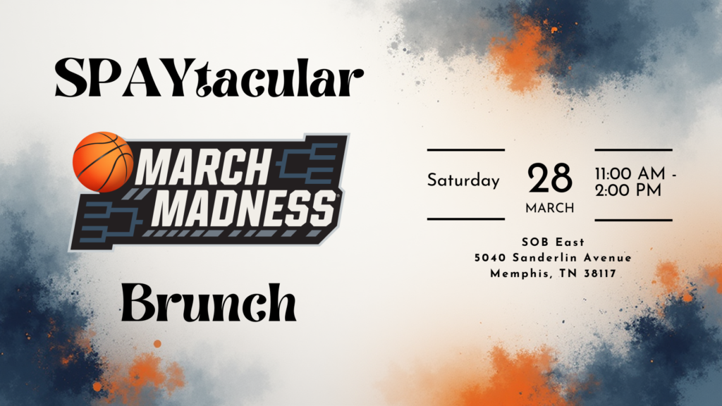 Join us for Spaytacular 2026 – a March Madness themed brunch event! This year’s event will be held Saturday, March 28, 2026 at SOB East from 11:00 am – 2:00 pm. Your $50 ticket for this event includes food and drinks from SOB East, live music, and in person viewing of all silent auction items! Purchase tickets now at https://spay-memphis.networkforgood.com/events/95936-spaytacular-2026.